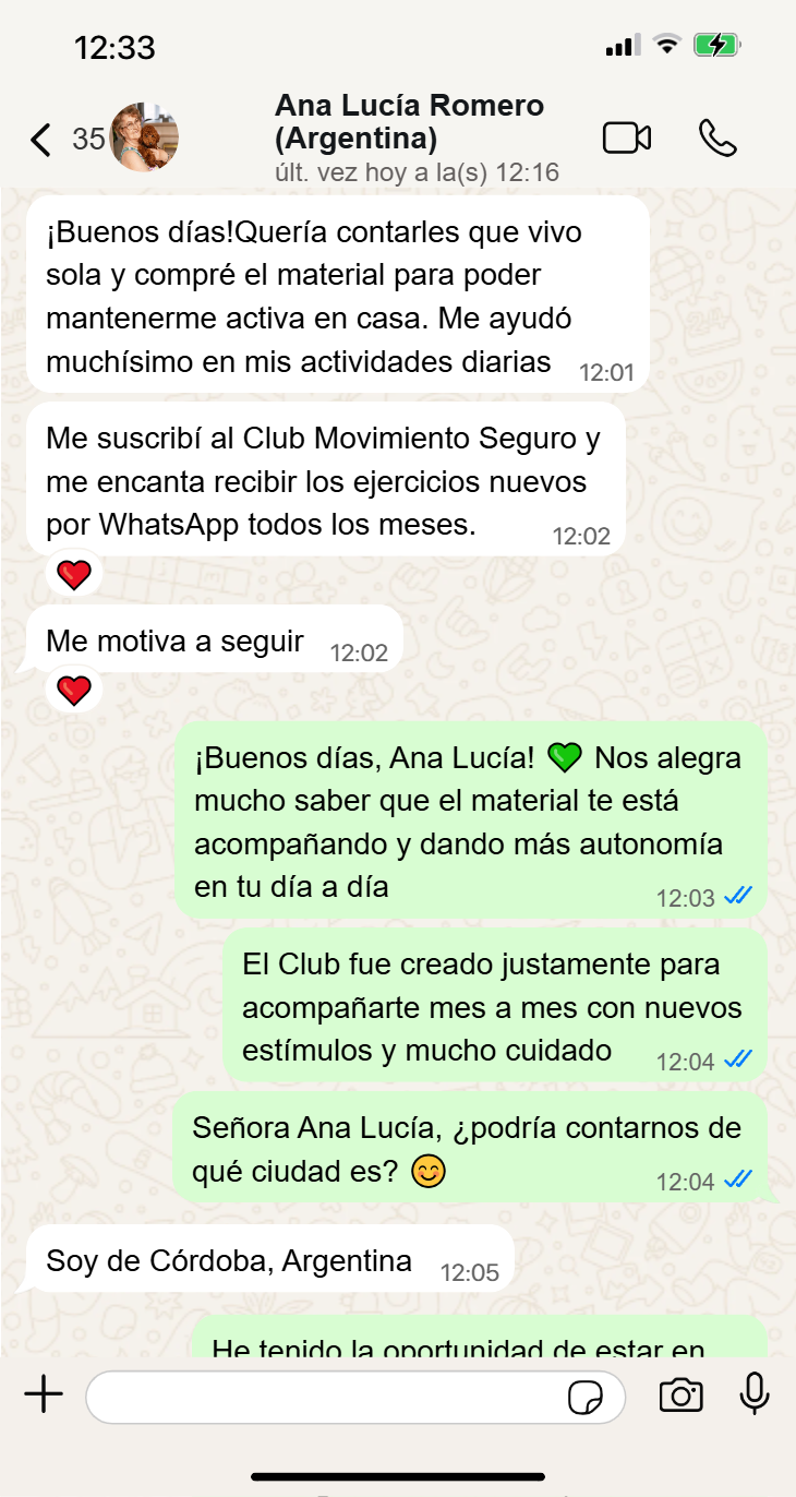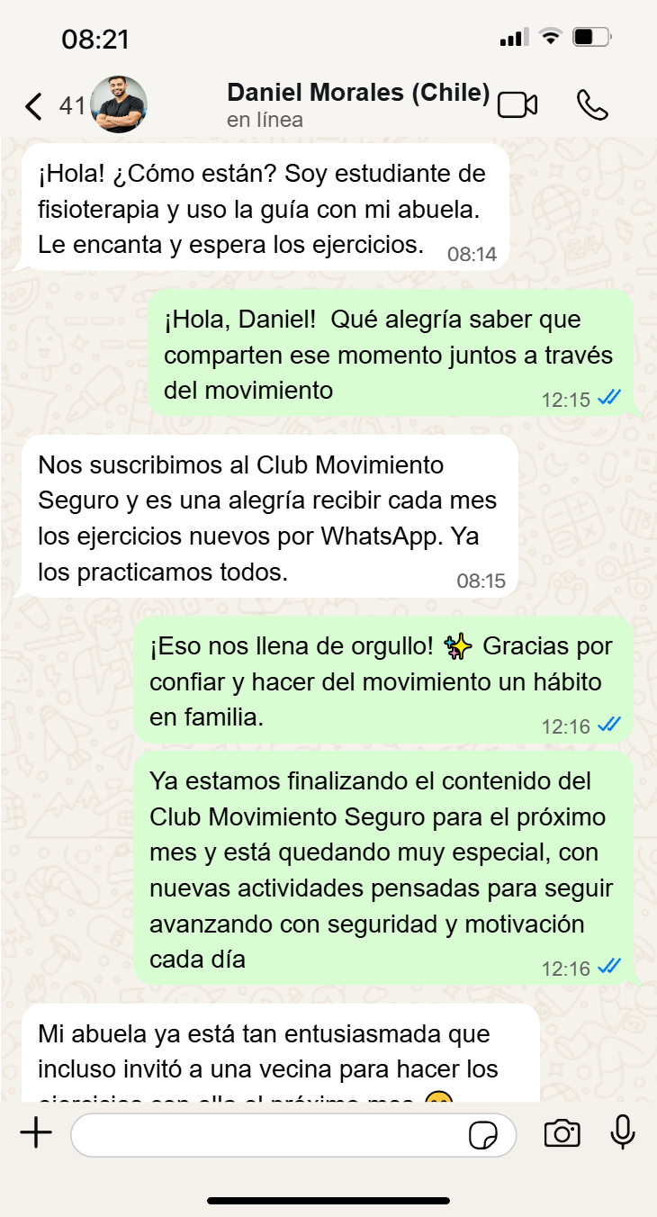 Si eliges el Plan Club Movimiento Seguro, además del acceso por email, recibirás contenido exclusivo todos los meses directamente en tu WhatsApp, con nuevas actividades, rutinas y materiales especiales para seguir avanzando sin interrupciones.